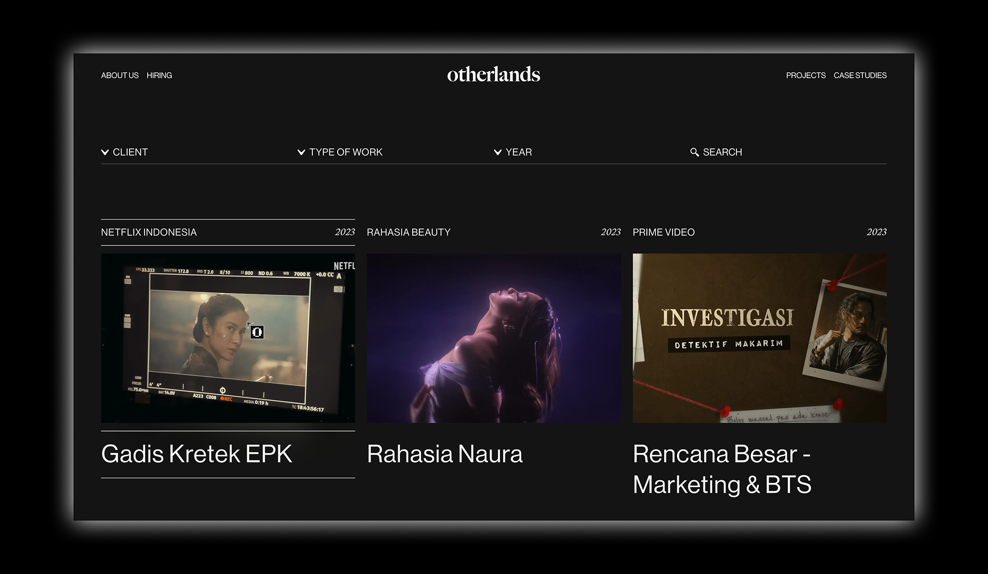 On this website, Otherlands showcases their portfolio, company information, case studies, and job openings. Notably, they prioritize enriching project details within their portfolios, aiming for enhanced clarity and ease of access.